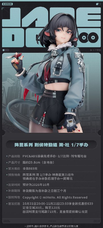 亲爱的绳匠,天猫「绝区零三Z官方旗舰店」、米游社「绝区零」商城目前已开启「阵营系列 刑侦特勤组 简·杜 1/7手办」的预售。