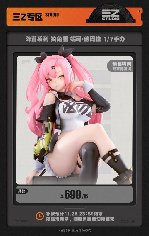 届时,店铺还将开放「阵营系列」狡兔屋 安比·德玛拉1/7手办、「LIMEPIE系列」艾莲·乔 1/8手办 从周一到周五Ver.的全款购买通道,及「阵营系列」狡兔屋 妮可·德玛拉 1/7手办的补款通道。